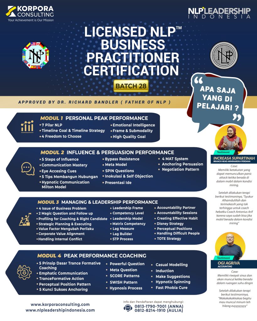 Pelatihan Licensed NLPᵀᴹ Business Practitioner Certification approved by Dr Richard Bandler adalah pelatihan NLPᵀᴹ Terlengkap dimana Business Growth dan Modelling Excellence people menjadi investasi terlengkap seumur hidup buat anda